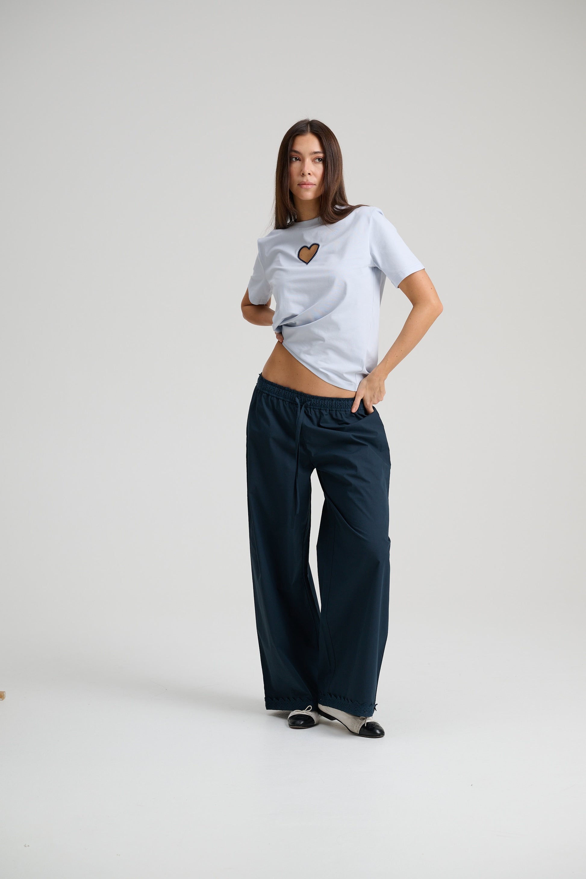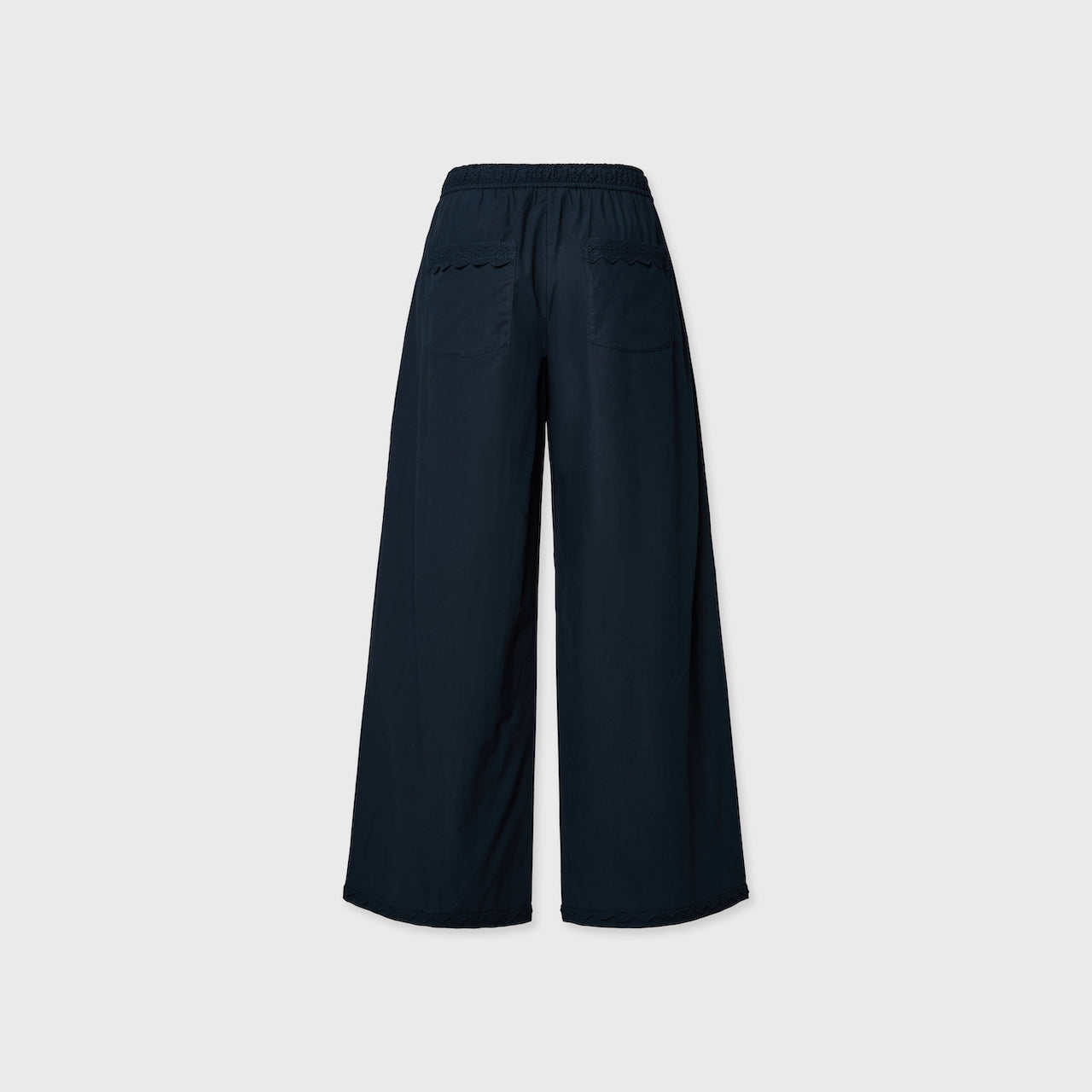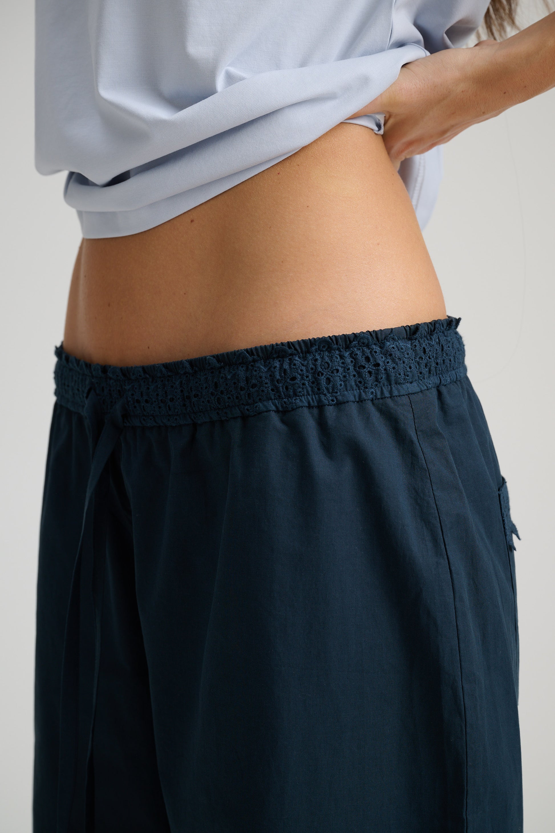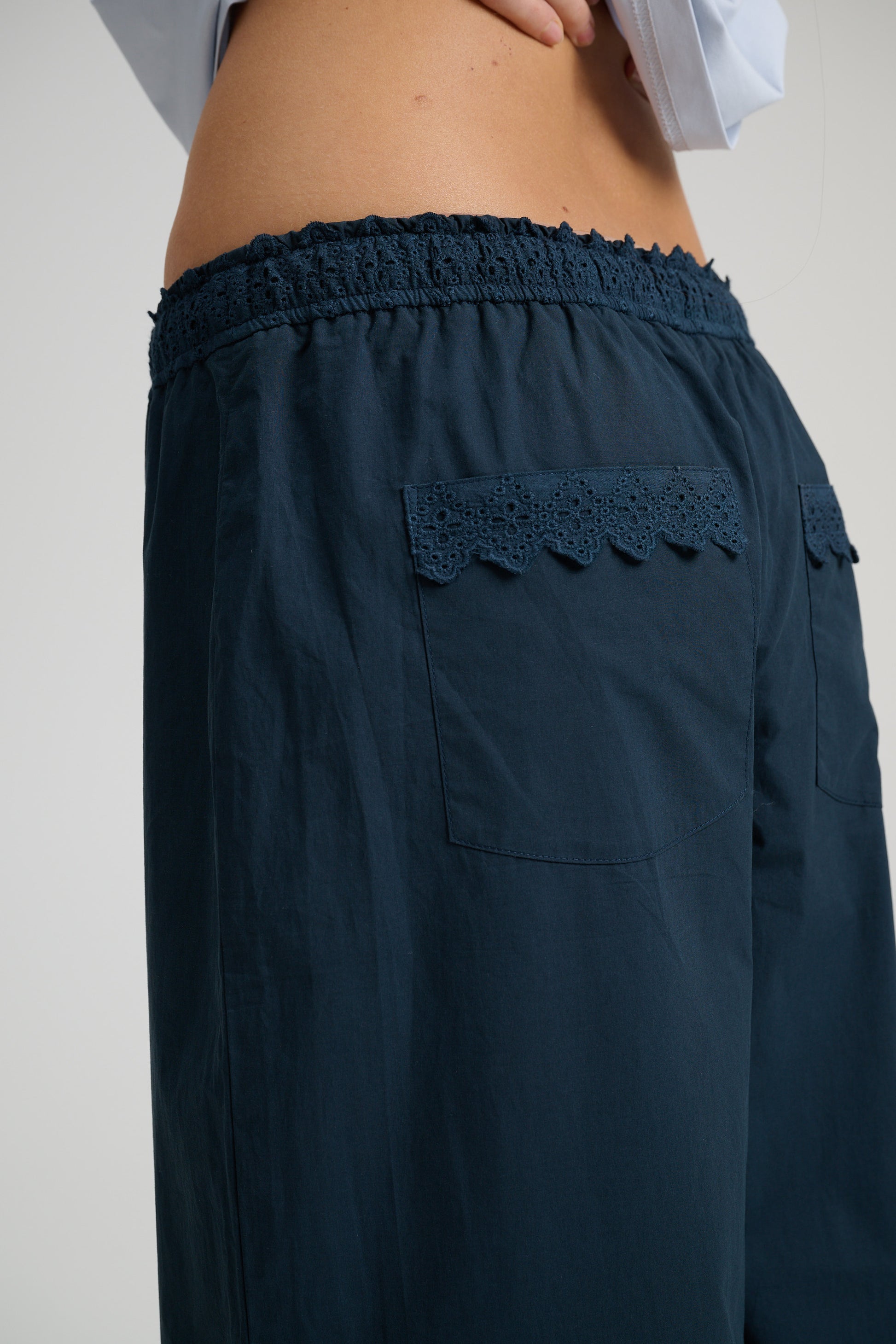 Introducing our luxurious Broderie Pants in navy. Made with intricate broderie fabric, these pants are a stunning addition to any wardrobe. Their delicate details and elegant design make them perfect for a sophisticated and exclusive look. Feel confident and chic in these premium pants.