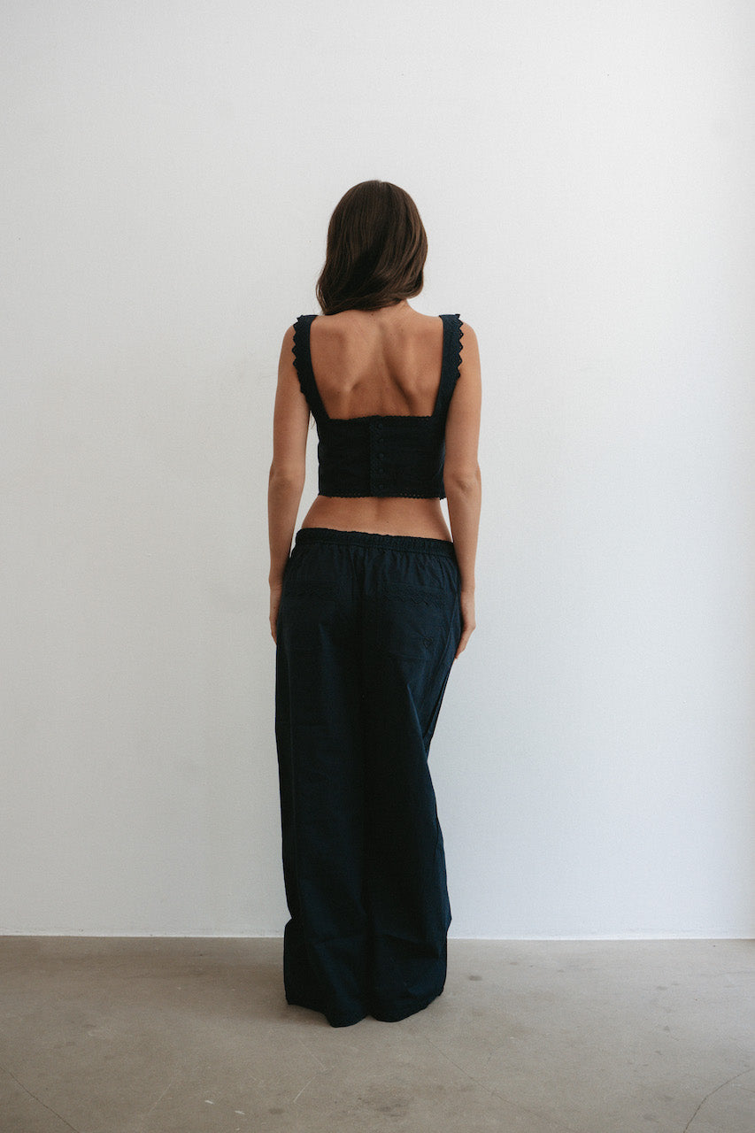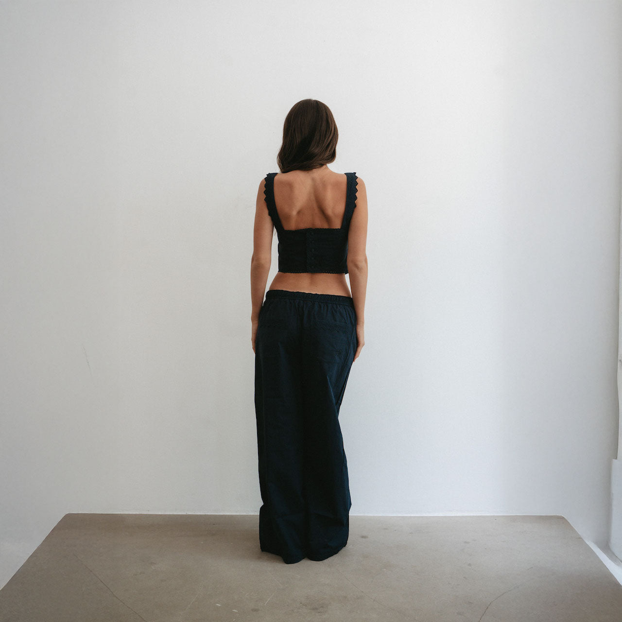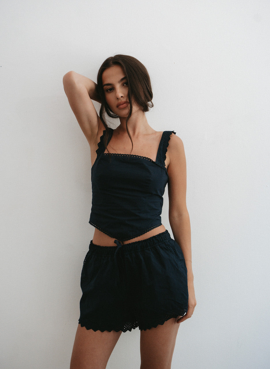 Impeccably tailored, this navy cotton Broderie Top sculpts the silhouette with architectural precision. The form-fitting design showcases intricate eyelet craftsmanship against sun-bronzed skin—a study in summer minimalism. An essential canvas for statement accessories or worn alone as testament to understated luxury.