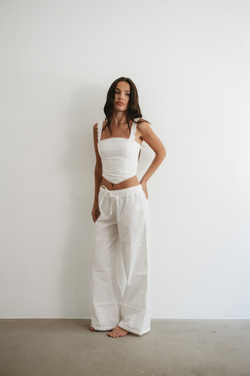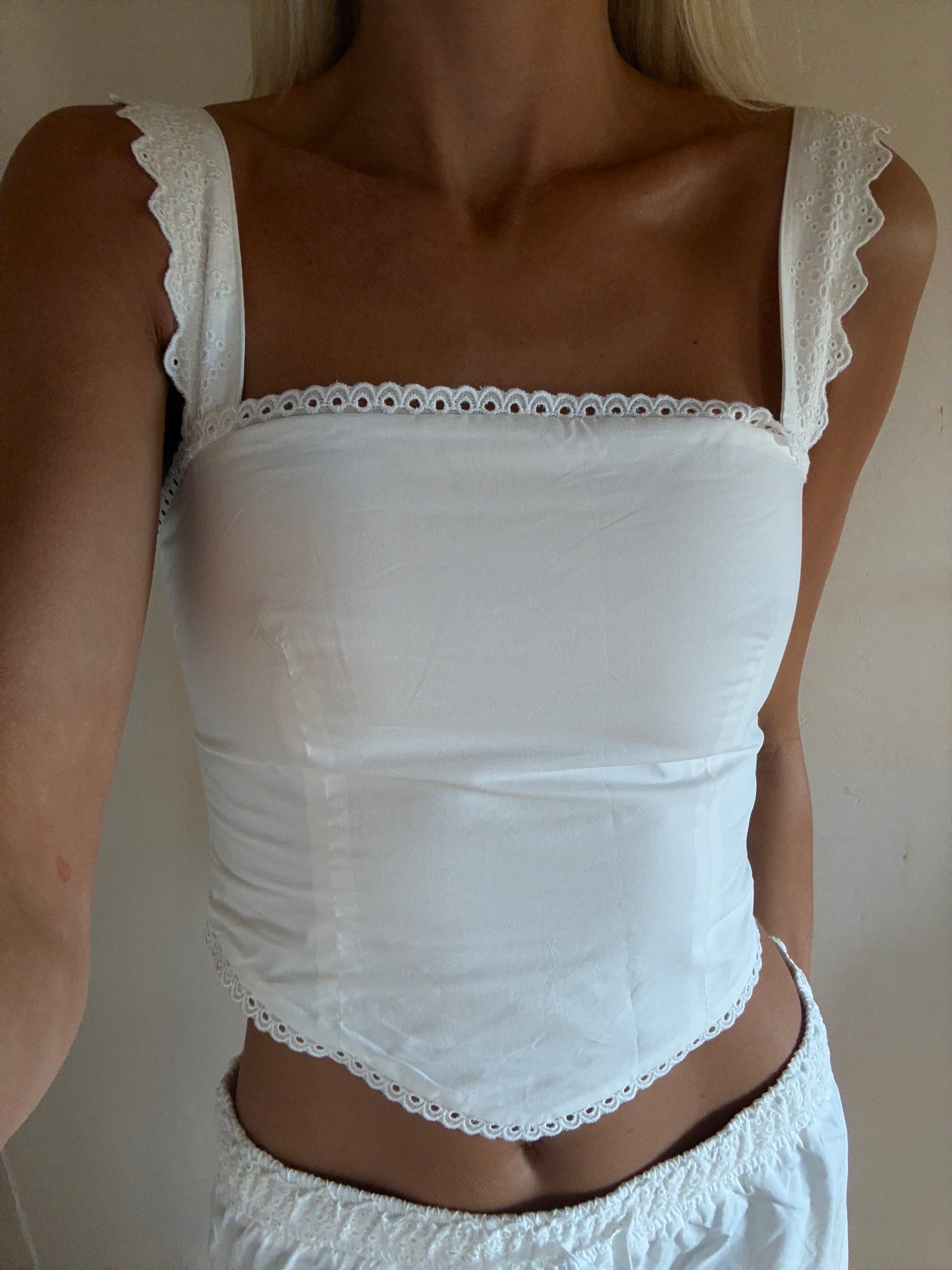Impeccably tailored, this white cotton Broderie Top sculpts the silhouette with architectural precision. The form-fitting design showcases intricate eyelet craftsmanship against sun-bronzed skin—a study in summer minimalism. An essential canvas for statement accessories or worn alone as testament to understated luxury.